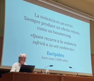Sede Ejea de los Caballeros: Tras una muy breve descripción del contexto actual, a continuación, se abordaron los siguientes temas: La violencia nos concierne a todos, La violencia aparece como la solución a los problemas, La transformación social y el cambio personal simultáneo, El poder de las imágenes, Revisar las intenciones y los pensamientos, Reflexionar sobre las pertenencias y las consecuencias, Las espirales de violencia, La violencia es un error. La actitud flexible afuera y firme adentro, Crítica y autocrítica, La ira, la huida y las consecuencias, Lo que cada uno puede hacer.